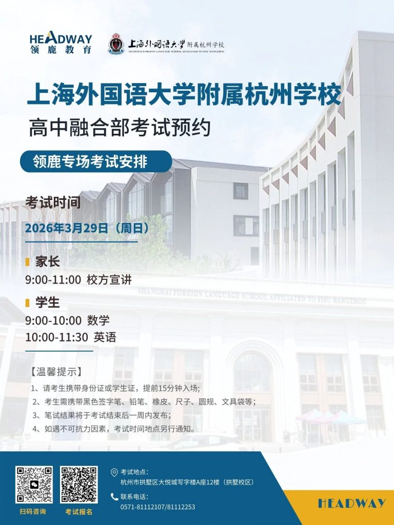 上海外国语大学附属杭州学校(简称“上外附杭州”)高中融合部,领鹿专场考试正式定档3月29日。对于目标明确、想走国际化教育路线的家庭来说,一定要提前锁定考试资格,才能抢占先手优势!