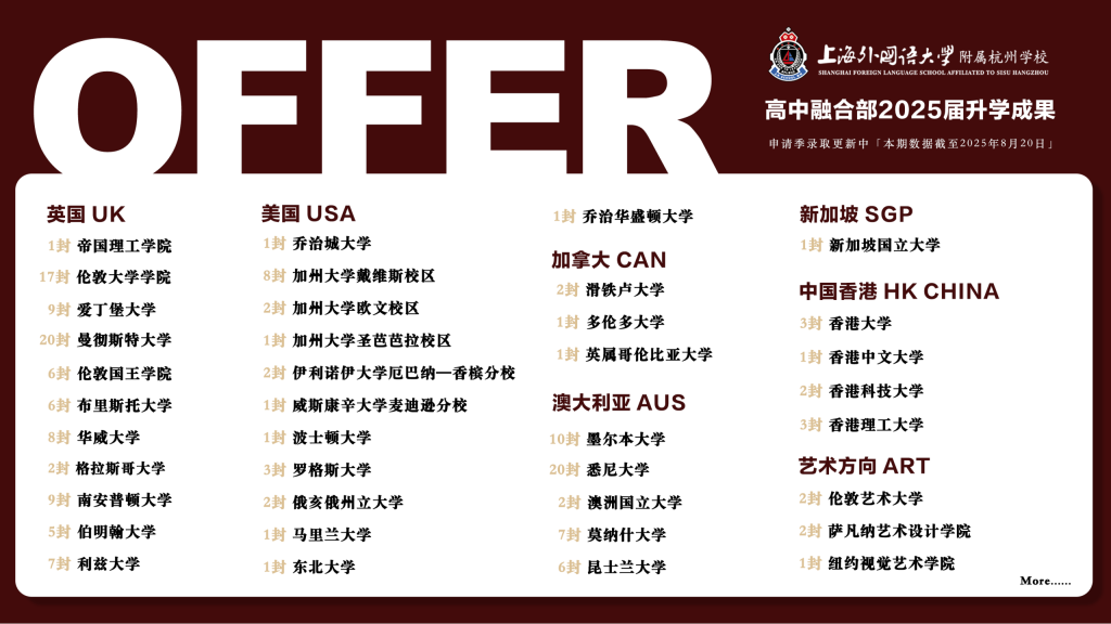 2025年申请季,上外附杭州高中融合部首届毕业生累计收获220+封OFFER,人均6份以上OFFER,累计获得奖学金超500万元,收获帝国理工学院(QS #2)录取1枚、新加坡国立大学(QS #8)录取1枚;乔治城大学(US News #24)麦克道诺商学院录取1枚;伦敦大学学院(QS #9)录取17枚,QS Top 50高校录取率92.1%。