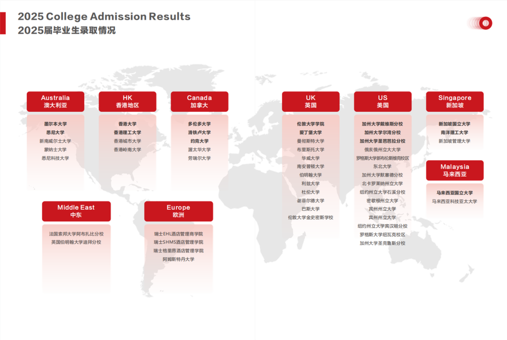 毕业生主要升学方向是以英语、日语等为学习语言的海外大学。学生可以根据专业和国家选择,申请包含但不限于英国、美国、加拿大、澳大利亚、新西兰、法国、日本、新加坡等国和香港、澳门地区的高等院校。