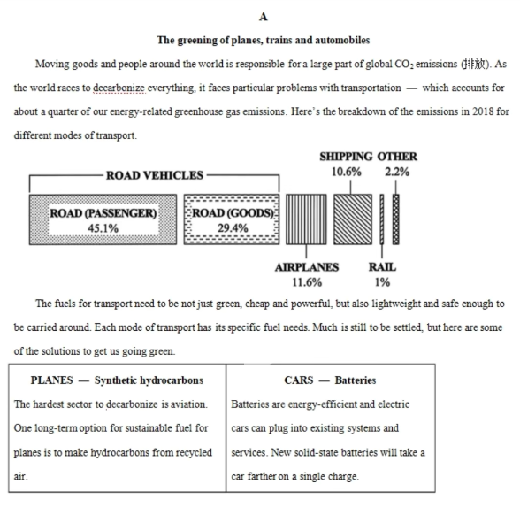 2025年高考A篇阅读“飞机、火车和汽车的绿色化”与《Unlock4》Unit 7“环境”单元中关于碳排放报告的内容高度吻合。