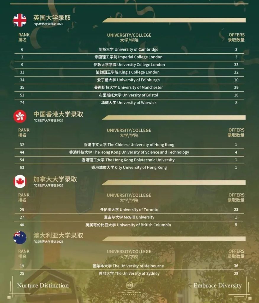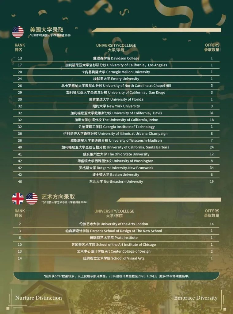 橄榄树学校2026届高三123位毕业生已斩获655封大学录取通知书,以下为录取汇总: