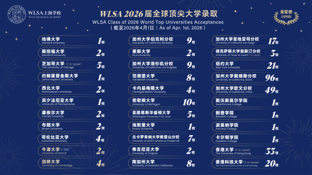 截至4月1日,WLSA本届170多名申请美本的学生中,在RD轮WLSA拿到了上海唯一一枚哈佛Offer;收获的藤校Offer有10枚,位列上海第一;